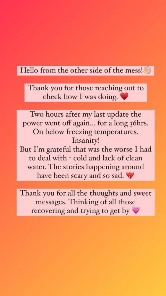 Below freezing temperatures in a place that is **not** prepared for such a thing and there goes an entire state without electricity and eventually without water on – did I mention that already? ? – below freezing temperatures.